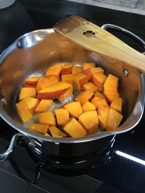 Dýni omytou a zbavenou dužiny a semen nakrájíme asi na 2 cm široké kostičky. V menším kastrůlku zvolna rozpustíme trochu másla a lehce orestujeme nakrájenou dýni. Zalijeme ji menším množstvím vody, přikryjeme pokličkou a vaříme zhruba deset minut. Kontrolujeme vodu, případně ji trochu dolejeme. Když je dýně měkká, kastrůlek odstavíme a tyčovým mixérem dýní rozmixujeme do hladkého pyré. Necháme pyré vychladnout.