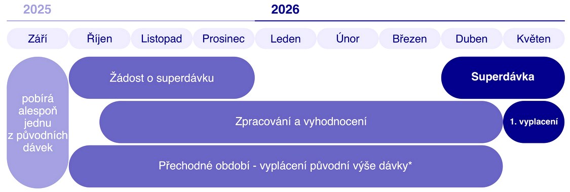 Rozhodnutí o přiznání nároku na tuto dávku obdrží v průběhu přechodného období, nejpozději do konce dubna 2026. První vyplacení superdávky bude po přiznání nároku následovat v květnu 2026.