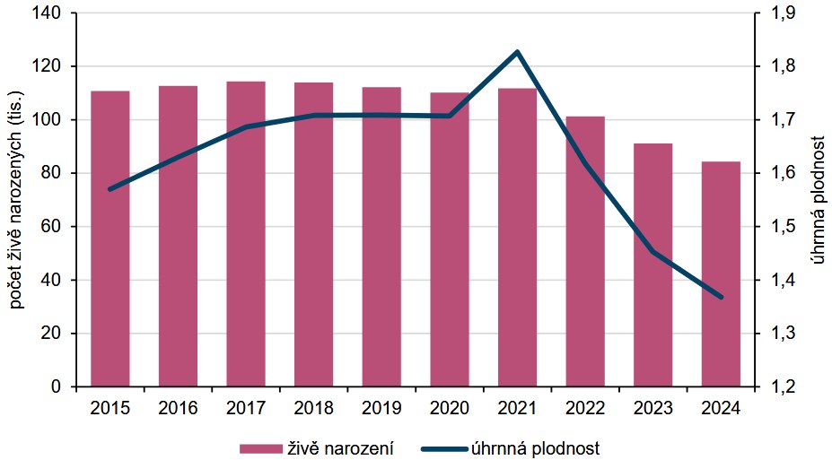 V roce 2024 poklesl počet živě narozených dětí potřetí v řadě. Tentokrát to bylo o 6,8 tisíce na historické minimum 84 311 dětí. Úhrnná plodnost – 1,37 dítěte na jednu ženu – byla v loňském roce nejnižší za posledních 18 let.
