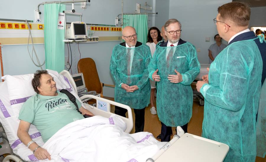 Premiér Petr Fiala a ministr zdravotnictví Vlastimil Válek při své návštěvě IKEM k příležitosti 40 let od první transplantace slinivky břišní v půlce roku 2023. / Foto: IKEM