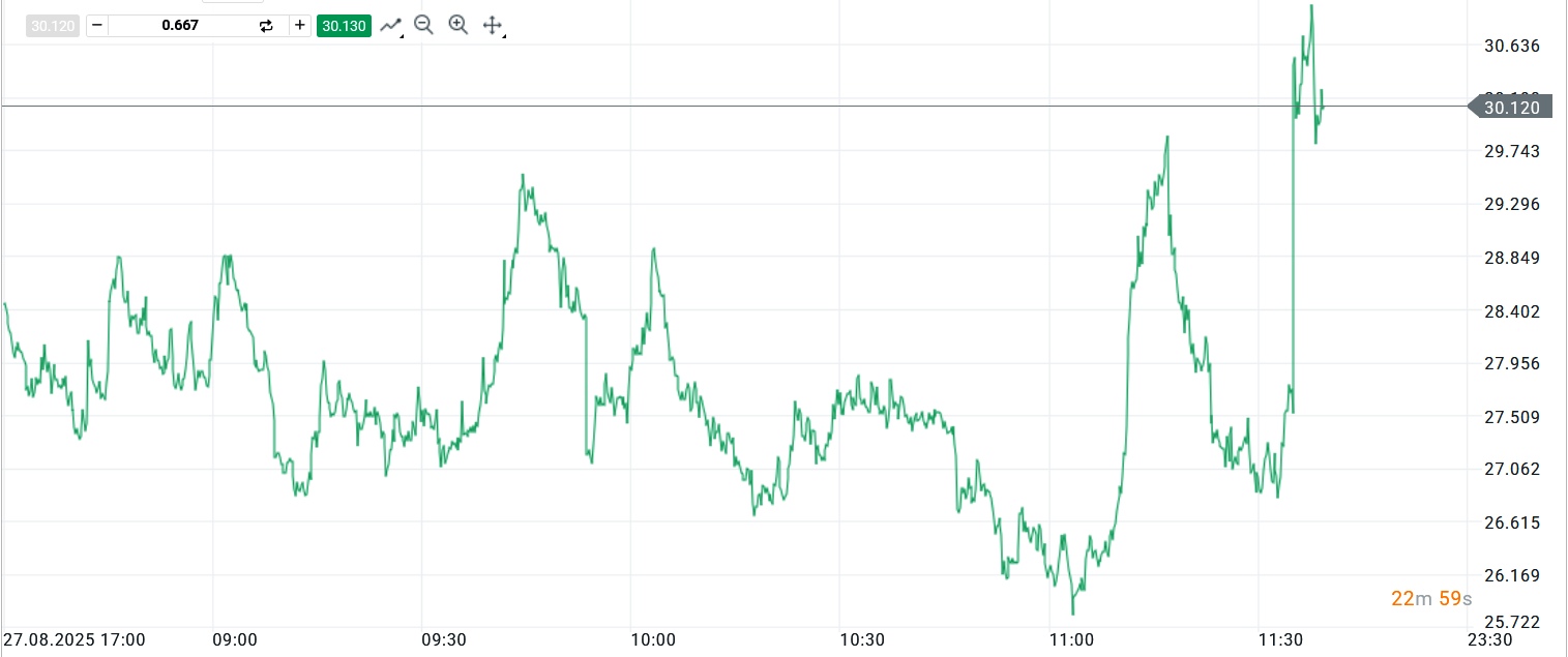 Německá společnost Bayer v pondělí [24.11.] zaznamenala prudký růst ceny akcií, to bezmála o 12 procent. Cena za akcii vyšplhala na hranici 30 eur [cca 724,5 Kč]. Což je nejvyšší úroveň od září 2024.