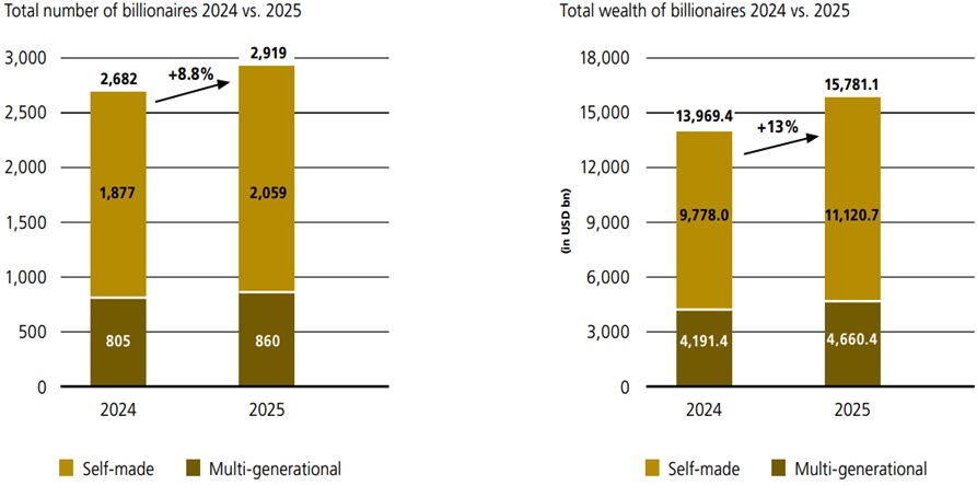 Podle výroční zprávy UBS se navíc formuje nová generace dolarových miliardářů. Jejich bohatství pohání podnikatelské inovace i zrychlující se předávání majetku mezi generacemi.